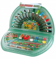 Malovací kufřík půlkruhový Dino je kompletní výtvarná sada pro děti v praktickém uzavíratelném kufříku. Najdete v něm fixy, voskovky, vodovky, pastelky, obyčejné tužky, pravítko, ořezávátko, gumu, štětec i samolepky s dinosaury – ideální na doma i na cesty.