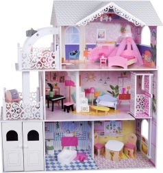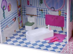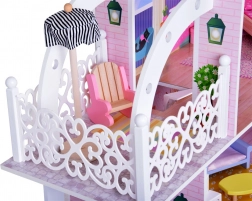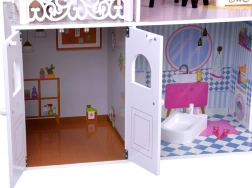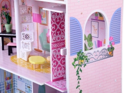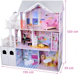 Výtah umožňuje pohyb panenek mezi patry a díky ažurovému provedení působí esteticky krásně. Rozměry domečku jsou: Výška: 120 cm, Šířka: 110 cm, Hloubka: 35 cm.