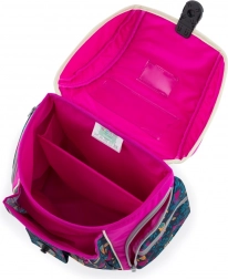 Magnetické zapínání, vnitřní rozřaďovač, více kapes a reflexní prvky pro bezpečný pohyb a snadný přístup ke školním potřebám.