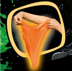 Tento jedinečný Jiggly Slime díky své speciální receptuře příjemně vibruje a třese se při dotyku, přitom se lehce natahuje do všech směrů. Je ideální pro dlouhé mačkání, přendávání z ruky do ruky, natahování i tvorbu bublin. Fluorescenční pigment mu propůjčuje sytou oranžovou barvu a efekt glow-in-the-dark pro ještě zábavnější hraní.