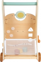 Součástí chodítka jsou také ozubená kola, překlápěcí destičky, vkládací hra se třemi různými tvary a hodiny s pohyblivými ručičkami, které zajišťují zábavu i učení. Praktická síť na zadní straně chodítka poskytuje úložný prostor na hračky. Kola s gumovými kroužky zajišťují tichou a bezpečnou jízdu.