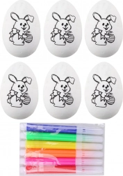 Sada obsahuje 6 vajíček a 6 barevných fixů – žlutý, oranžový, červený, modrý, růžový a zelený – takže můžete hned začít. Tvoření podporuje jemnou motoriku, koordinaci ruka–oko a dětskou fantazii.