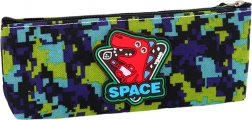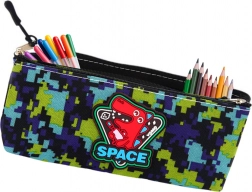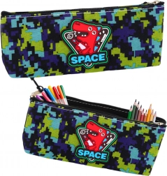 Tato kosmetická taška vás zaujme pestrým pixelovým vzorem v barvách modré, zelené a černé s grafickým motivem vesmírného dinosaura.