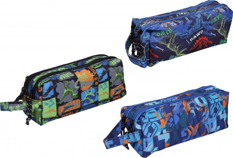 Stylový penál etue s klučičím motivem v rozměrech 21x7x9 cm, dostupný ve třech barevných provedeních.
