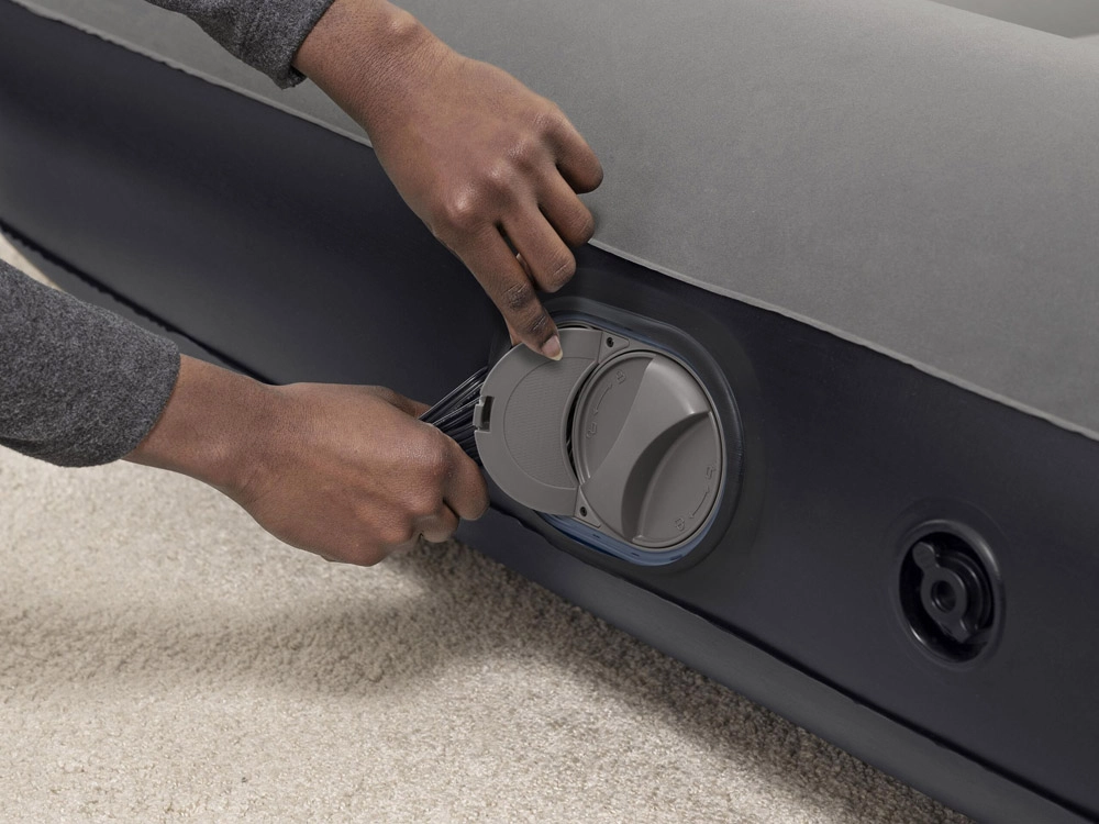 Integrovaná pumpa s USB napájením nafoukne matraci za 3–4 minuty. Snadná obsluha doma, na chatě i v kempu – stačí připojit k adaptéru nebo powerbance.