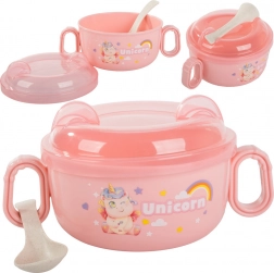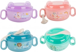 Dvojité úchyty usnadní držení malým ručkám. Veselé motivy jako dinosaurus, medvídek, jednorožec či králíček podpoří radost z jídla.
