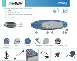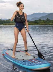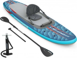 V několika krocích z něj vytvoříte pohodlný sit-on-top kajak – stačí připnout sedák s opěrkou a podnožník. Integrované úchyty, elastické lana vpředu i vzadu a zadní D-kroužky umožňují upevnit osobní věci či chladicí tašku. Tři odnímatelné ploutve zlepšují směrovou stabilitu, rychloupínací bezpečnostní leash lze nosit na kotníku i v pase. Dvojčinná ruční pumpa zajistí rychlé nafouknutí a po jízdě desku snadno vyfouknete a uložíte do deluxe batohu.
