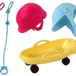 Roztomilý pes husky se žlutými sáňkami/vozíkem a helmy pro bezpečnou hru podporují péči, kreativitu a role-play.
