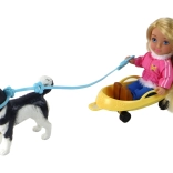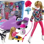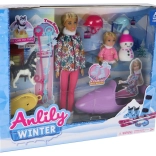 - Hlavní panenka ANLILY, malá panenka, pes husky na vodítku, žluté sáňky/vozík, fialový sněžný skútr, brusle, 2 helmy, sněhulák, drobné doplňky