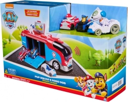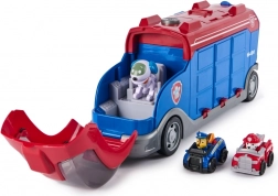 Součástí sady jsou dvě mini závodní auta hrdinů Chase a Marshall a figurka Robo‑pejska s malým vozidlem. Transportér má rolující kola, skládací rampu a chytře řešený úložný prostor pro jednoduché vypravení jednotky.