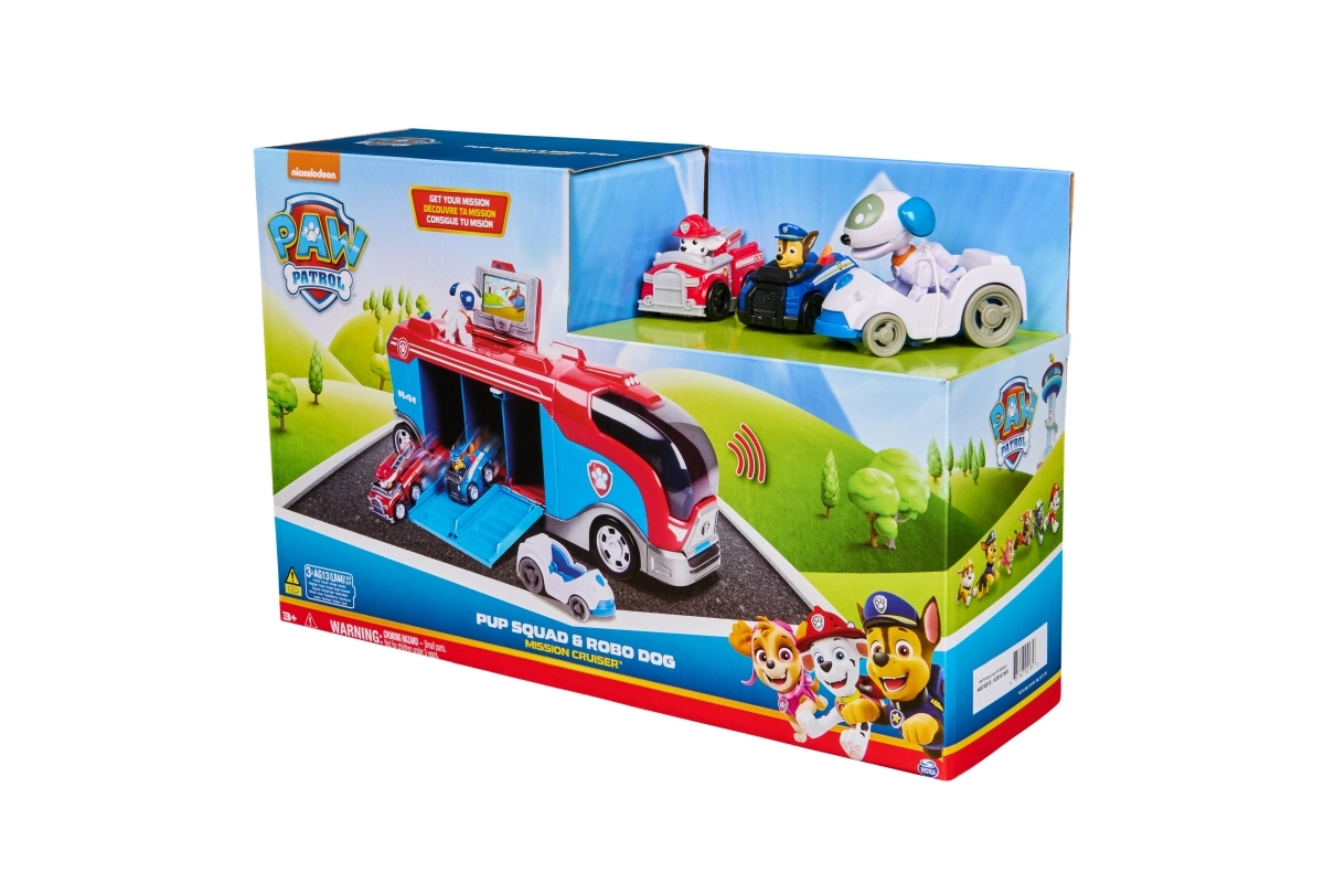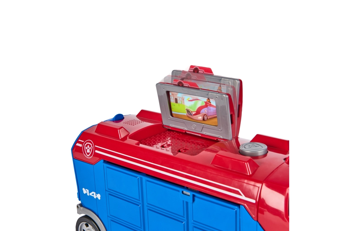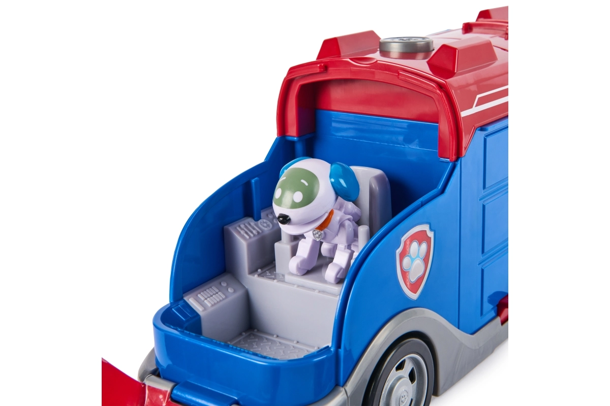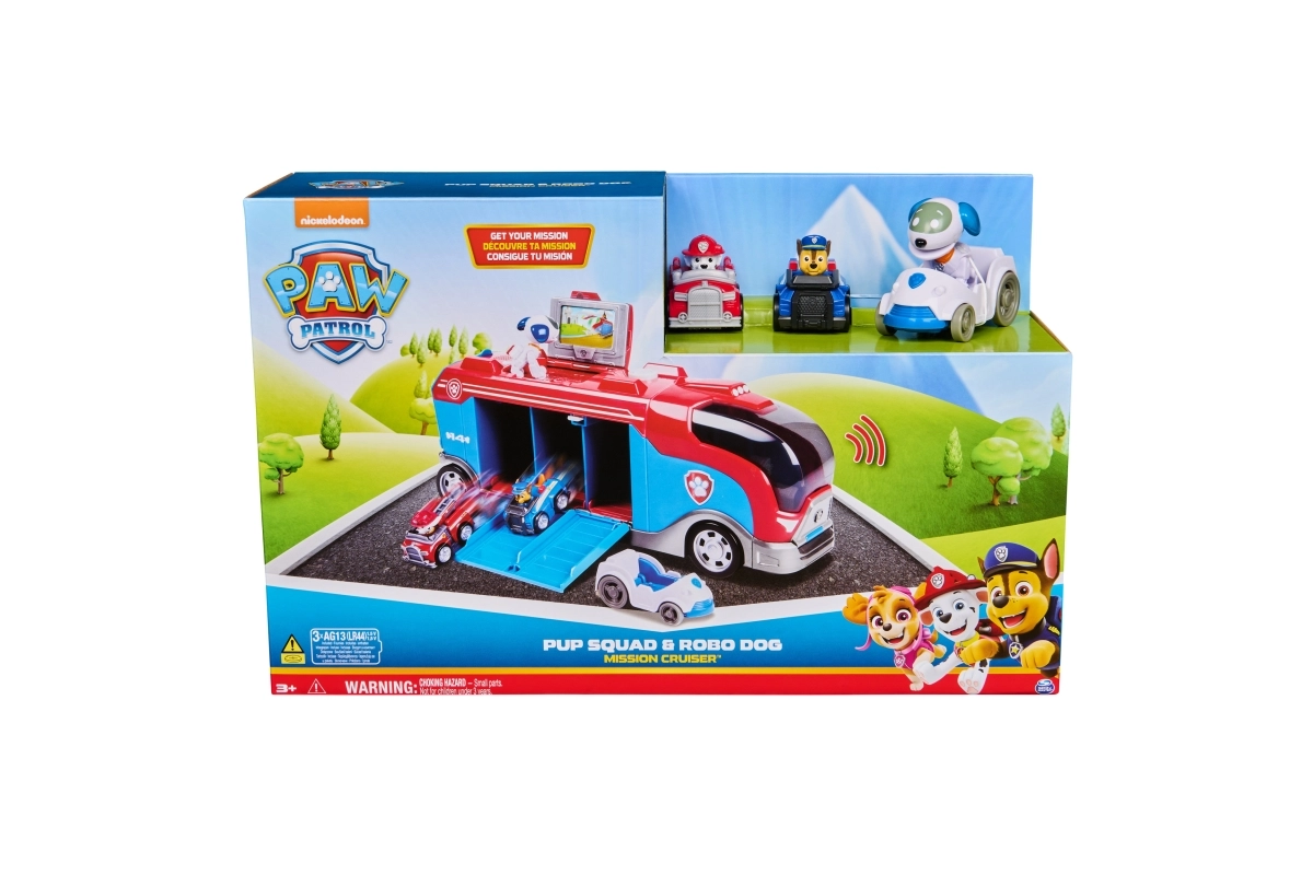 Mission Cruiser je mobilní velitelství, které děti okamžitě vtáhne do světa Tlapkové patroly. Otevíratelné boční panely odhalí parkovací místa pro mini vozidla a interaktivní monitor s kartou mise pomůže naplánovat další akci. Díky zvukům přímo ze seriálu je každá výprava ještě napínavější.