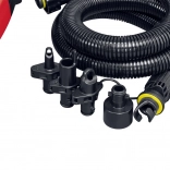 Součástí je flexibilní hadice a čtyři adaptéry pro širokou škálu ventilů – od matrací přes čluny až po paddleboardy.