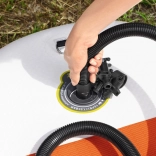 Díky regulaci po 0,5 PSI snadno nastavíte ideální tlak pro SUP až do 16 PSI, ale i pro matrace či bazénové hračky. Silikonové nožky zajišťují stabilitu na různých površích a čtyři adaptéry pokryjí většinu běžných ventilů.