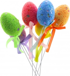 Vytvořte si veselou jarní výzdobu během chvilky. Sada obsahuje 6 dekorativních vajíček na zápichu v různých barvách, které krásně vyniknou ve váze s větvičkami, v květináči nebo v proutěných aranžmá. Lehký polystyren s povrchem posetým kuličkami a drobnými vzory působí hravě a elegantně zároveň.