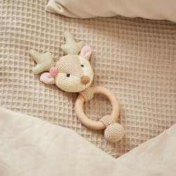 Tato stylová motorická hračka s dřevěným kroužkem a textilním jelínkem je ideální pro první měsíce života. Kombinace přírodního dřeva a hebké látky podporuje smyslové vnímání, jemnou motoriku i koordinaci ruka–oko. Elegantní design v pískových tónech potěší děti i rodiče.