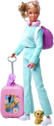 Panenka Steffi Love Cestovatelka je připravena na každé dobrodružství. Má pohodlnou tyrkysovou teplákovou soupravu, bílé tenisky a brýle, aby byla na cestách vždy šik. Doplňky jako růžový kufr s potiskem, cestovní polštářek, batůžek a roztomilý pejsek dělají z hraní zábavnou a realistickou cestovatelskou výpravu.