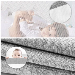 Horní část bariéry lze snadno sklopit pomocí tlačítka, takže se do postele dostanete bez demontáže. Odnímatelný potah lze vyprat a udržovat v čistotě. Integrovaná kapsa pojme dudlík, ubrousky či drobné hračky – vše máte vždy po ruce.