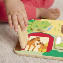 Tato hrací deska obsahuje 4 dvířka, která se otevírají a odhalují různá přátelská zvířátka a jejich mláďátka. Velikost dvířek je ideální pro malé ručičky, což usnadňuje manipulaci a podporuje rozvoj jemné motoriky.
