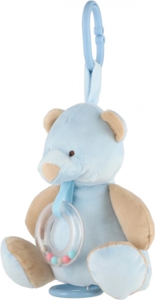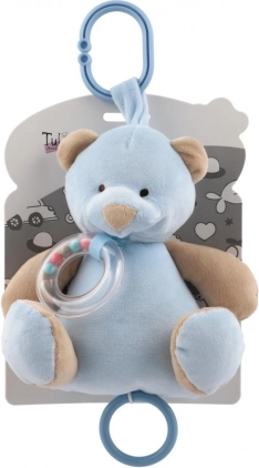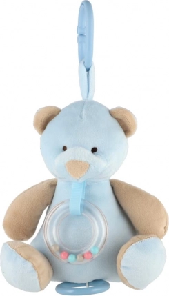 Tento hebký plyšový medvídek v jemné modré barvě je ideálním společníkem pro novorozence a kojence. Díky závěsnému klipu ho snadno připevníte na kočárek, autosedačku nebo postýlku, takže bude vaše miminko doprovázet všude. Průhledný chrastící kroužek s barevnými korálky poskytuje jemnou zvukovou stimulaci, která děti zaujme a uklidní.