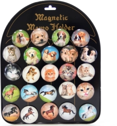 Dekorativní sada 24 kusů magnetů s motivy psů, koček a koní potěší děti i milovníky zvířat. Každý magnet má přibližně 4 cm, dodáváno na magnetické tabuli se stojánkem o rozměru cca 22 × 27 cm. Ideální jako výzdoba lednice, tabule či kanceláře.