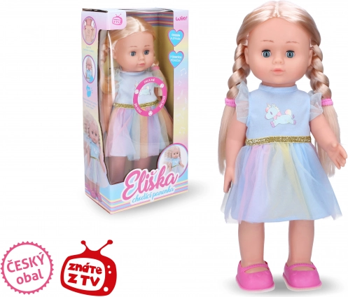 Seznam se s panenkou Eliškou – tvou novou nejlepší kamarádkou pro hraní i učení. Umí se procházet, tancovat a po tlesknutí zazpívá až 7 oblíbených lidových písniček. Díky dvěma režimům (Try me/ON) si vybereš, zda bude jen zpívat, nebo i chodit. S výškou 41 cm a roztomilými modrými šaty je ideální pro děti od 3 let.