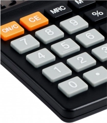 Disponuje základními aritmetickými operacemi, funkcemi paměti (M+, M-, MR, MC), výpočtem procent a odmocninou. Kontrastní oranžová funkční tlačítka a velké číslice zajišťují rychlou orientaci a minimalizují chyby při zadávání.
