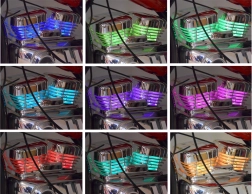 - Světelné efekty: cylindry blikají do rytmu hudby, samostatné tlačítko pro přední lampu, přepínač jízdy pomalá/rychlá.