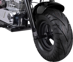Robustní ocelový rám, nafukovací pneumatiky a zadní odpružení tlumí nerovnosti na asfaltu i dlažbě. Pro první jízdy poslouží boční kolečka, která lze později odejmout; při stání potěší praktická stojánka. Díky nosnosti až 80 kg si chopper užijí i starší děti.