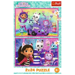 Puzzle 2x24 Zabawy s Gabby jsou ideální pro všechny děti, které milují skládání. Kombinují dva obrázky z oblíbené pohádky Koci domek Gabi, každý o velikosti 275x180 mm.