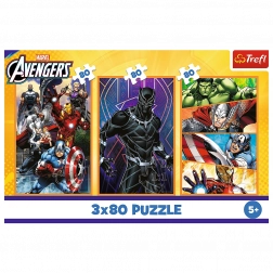 Puzzle 3x80 Akční Dny představují úžasné scény s oblíbenými superhrdiny Avengers jako Captain America, Black Panther, Thor, Iron Man a Hulk. Každá skládačka po složení vytvoří obrázek o rozměrech 275x180 mm.