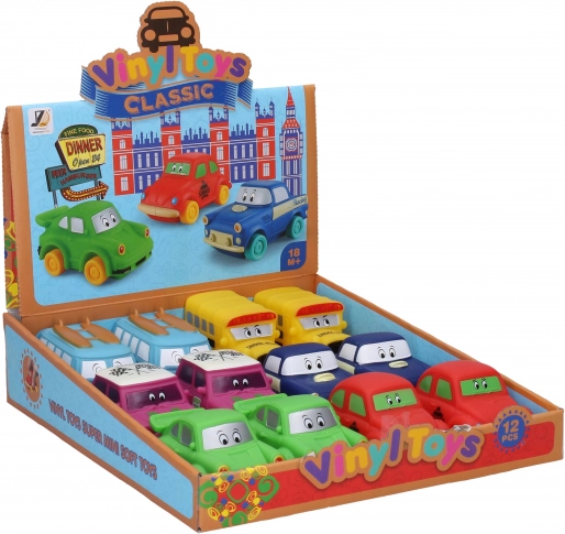 Lehoučké autíčko z měkkého plastu o délce 9 cm s volně běžícími koly. Na výběr je 6 variant: Brouk, Trabant, sporťák, Mini, autobus, dodávka. K dispozici také display box 12 ks.