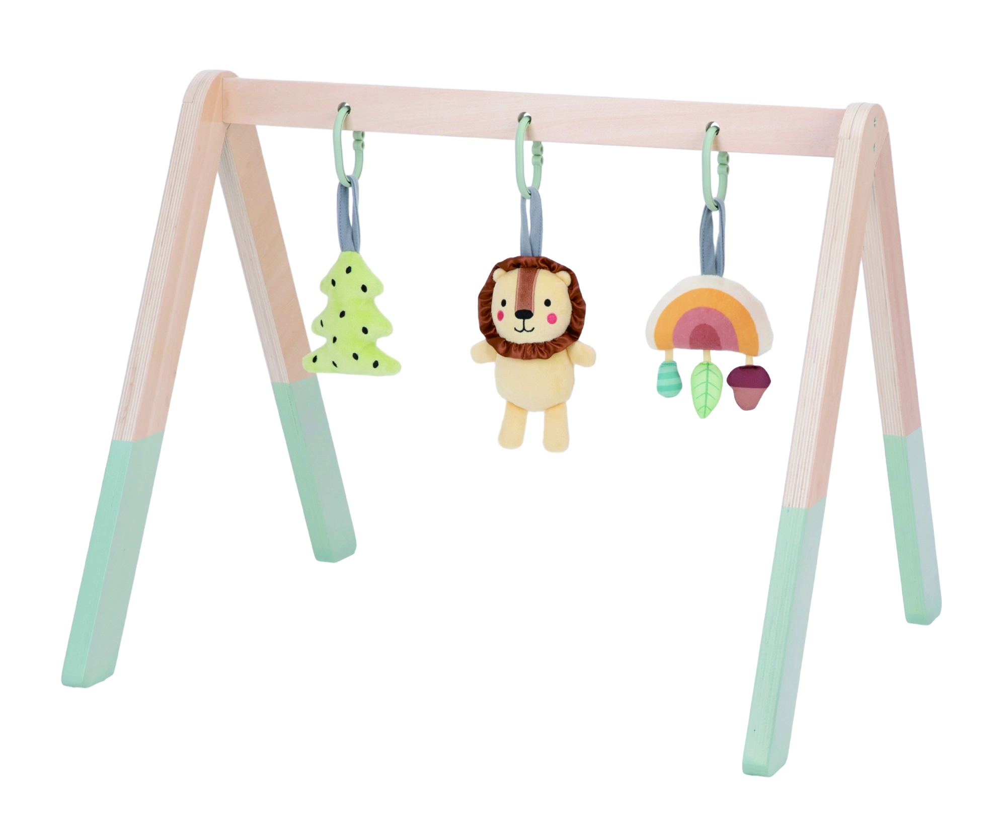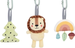 Součástí setu je barevná „stromečková“ závěska se šustivým efektem, roztomilý lev s chrastítkem a zvonečkem a třpytivá duha s třemi menšími prvky různých textur a barev, která po stisknutí píská. Vše je vyvedeno v pastelových barvách a natřeno bezpečnými barvami vhodnými pro děti.