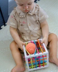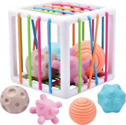Tato senzorická kostka s pružnými gumičkami je ideální pomůckou pro děti, které rády objevují svět dotykem. Měkké tvary s různými povrchy děti snadno uchopí, stisknou a protlačí skrz elastické pásky. Hra přirozeně rozvíjí , hmat a koordinaci, zároveň posiluje trpělivost a logické myšlení.