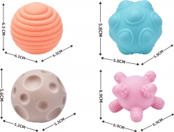 Čtyři měkké dílky s různou texturou a barvou povzbuzují hmatové vnímání, zlepšují jemnou motoriku a podporují učení barev a tvarů.