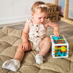 Vkládání a vyjímání dílků přes pružné pásky i klasický sorter učí děti přesnému úchopu, rozvíjí koordinaci ruka–oko a podporuje zvědavost při objevování nových tvarů a textur.