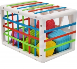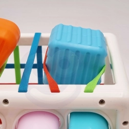 Pružné elastické gumky na stěnách kostky umožňují dětem jednoduché zasouvání a vytahování dílků, trénují jemnou motoriku a činí hru plynulou a motivující.
