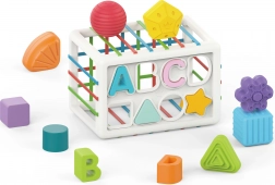 Jedna stěna kostky je klasický sorter s výřezy na tvary a písmena. Děti se zábavnou formou učí rozpoznávat tvary, barvy a první písmena.