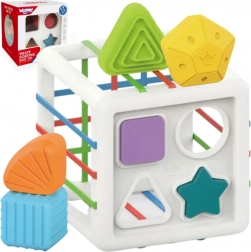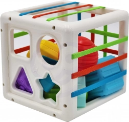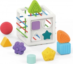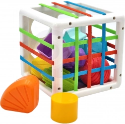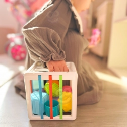 Tato barevná senzorická kostka kombinuje dvě oblíbené aktivity: vkládání dílků přes elastické pásky a třídění do tvarových otvorů. Děti se učí rozpoznávat barvy a geometrické tvary, rozvíjejí zvídavost i schopnost soustředění. Pevné dílky se snadno uchopují a kostka má praktickou konstrukci pro pohodlné přenášení i úklid.