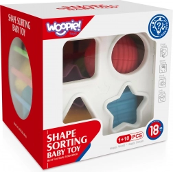 Senzorická kostka WOOPIE je chytrá hračka pro děti od 18 měsíců, která podporuje poznávání tvarů a barev, rozvoj jemné motoriky a smyslové vnímání. Díky elastickým gumkám a jedné stěně s klasickým tvarovým sorterem si děti procvičí koordinaci a logické myšlení při vkládání a vyjímání 11 pevných dílků různých tvarů a textur.