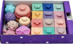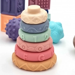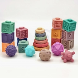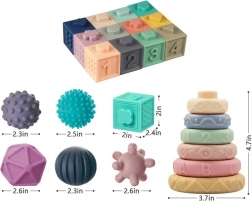 Měkký silikon s různými texturami, barvami a tvary stimuluje hmat, zrak i sluch. Čtvercové kostky po stisku pískají a motivují k dalšímu zkoumání.