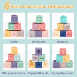 Měkký materiál je šetrný k dásním a poslouží i jako kousátko. Kostky lze vzájemně propojovat, stavět věže a trénovat koordinaci, motoriku a logické myšlení. Součástí je také praktický sáček pro ukládání a přenášení – ideální na doma i na cesty.