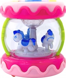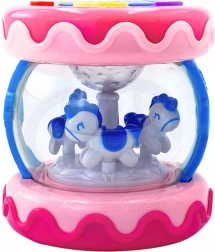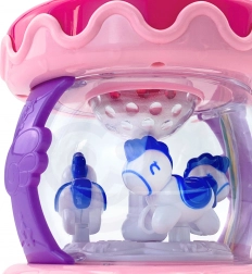 Vnitřní část hračky obsahuje kolotoč s koníky, které se otáčí při aktivaci zvuků, což poskytuje zábavu a vizuální stimulaci.