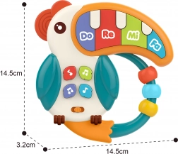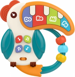 Pelikán od Woopie je ideální první hudební hračka pro nejmenší. Díky barevným klávesám s tóny „Do, Re, Mi, Fa“ děti snadno objevují svět hudby, zatímco posouváním korálků a tisknutím tlačítek trénují jemnou motoriku i oko–ruka koordinaci. Měkký hřeben a oblouk s kroužky zároveň fungují jako kousátko pro úlevu při prořezávání zoubků.