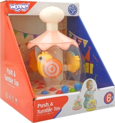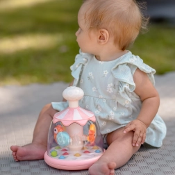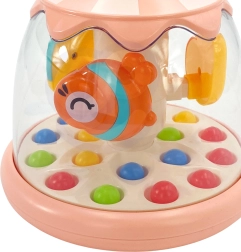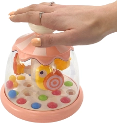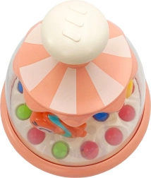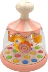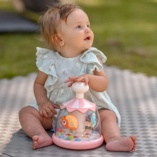 Objevte kouzlo jednoduché interaktivní hry: stačí zatlačit na velké horní tlačítko a průhledná kopule se promění v mini kolotoč se zvířátky a skotačícími kuličkami. Děti si užijí barevné efekty, pohyb a jemné zvuky, které přirozeně rozvíjejí jejich smysly.