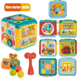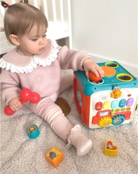 - 6 v 1 (piano, zatloukání míčků s kladívkem, sorter tvarů a dvířka se zámkem, labyrint, provlékačka, hodiny s chrastítkem)