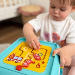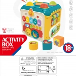 Každá strana nabízí jinou zábavu – piano, zatloukání míčků, sorter, labyrint, provlékačku a hodiny s chrastítkem. Ideální pro pestrou hru i učení.