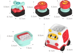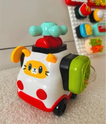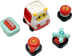 - autíčko Kočička + 4 manipulační bloky (chustička, točící kolečko, mačkací dávkovač, šroubovací víčko)