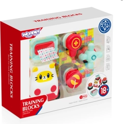 Každý blok nabízí jinou dovednost: vytahování a schovávání chustičky pro senzomotoriku, otáčecí kolečko pro koordinaci, mačkací dávkovač pro trénink síly prstů a šroubovací víčko pro nácvik úchopu a rotace. Zábava se tak promění v edukativní aktivitu, která podporuje všestranný rozvoj.
