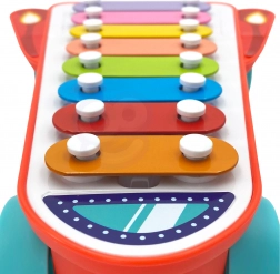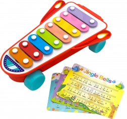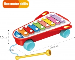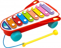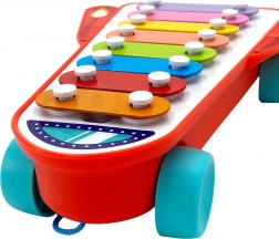 Xylofon funguje jako hudební nástroj i jako barevná tahací hračka díky pevným kolečkům a připevněné paličce.