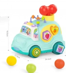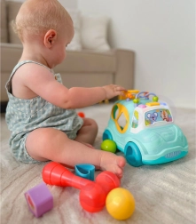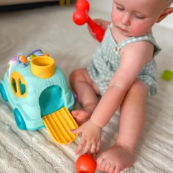 Autíčko má spoustu prvků k manipulaci a objevování. Dítě může použít přiložené kladívko, aby vkládalo barevné míčky do interiéru autíčka. Míčky poté vylétnou zadní klapkou, což dítěti přinese další potěšení a překvapení.